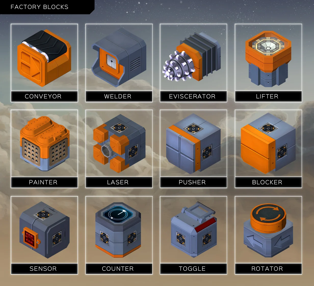 While enslaved by the Alien Overlords, your tools of the trade consist of a variety of different factory blocks. Conveyors, welders, and lasers are just a few of the tools that players use to assemble their factories and build products.