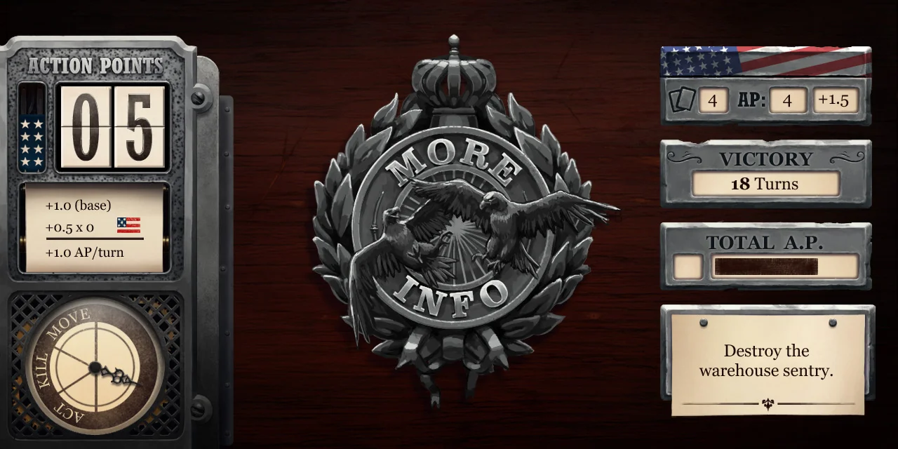 Ironclad Tactics features a user interface that draws inspiration from many aspects of 19th century America. The menus take their visual style from maps, newspapers, and playbills from the 1800's. The HUD and other in-game elements are physical pieces that are modeled after the well-worn, handmade equipment and weapons that you would find in a soldier's rucksack.